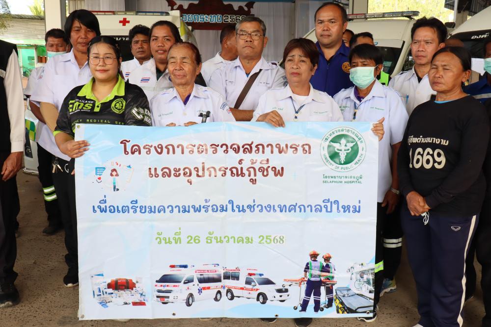 วันที่ 26 ธันวาคม 2568 นพ.บุญมี โพธิ์สนาม ผู้อำนวยการโรงพยาบาลเสลภูมิ พร้อมด้วย นายประสิทธิ์ มณีโสม สาธารณสุขอำเภอเสลภูมิ และคณะเจ้าหน้าที่งานการพยาบาลผู้ป่วยอุบัติเหตุฉุกเฉินและนิติเวช ได้ร่วมกันตรวจความพร้อมรถกู้ชีพและอุปกรณ์ของเครือข่ายกู้ชีพอำเภอเสลภูมิ การตรวจความพร้อมในครั้งนี้จัดขึ้นเพื่อเตรียมรับสถานการณ์ช่วงเทศกาลปีใหม่ พ.ศ. 2568 มุ่งเน้นการป้องกันและลดอุบัติเหตุทางถนน ตลอดจนเพิ่มประสิทธิภาพในการช่วยเหลือผู้ประสบเหตุอย่างทันท่วงที ในโอกาสนี้ คณะผู้บริหารได้มอบนโยบายด้านการปฏิบัติงาน พร้อมให้กำลังใจแก่ทีมกู้ชีพอำเภอเสลภูมิ ณ สวนสุขภาพสระศาลาลอย