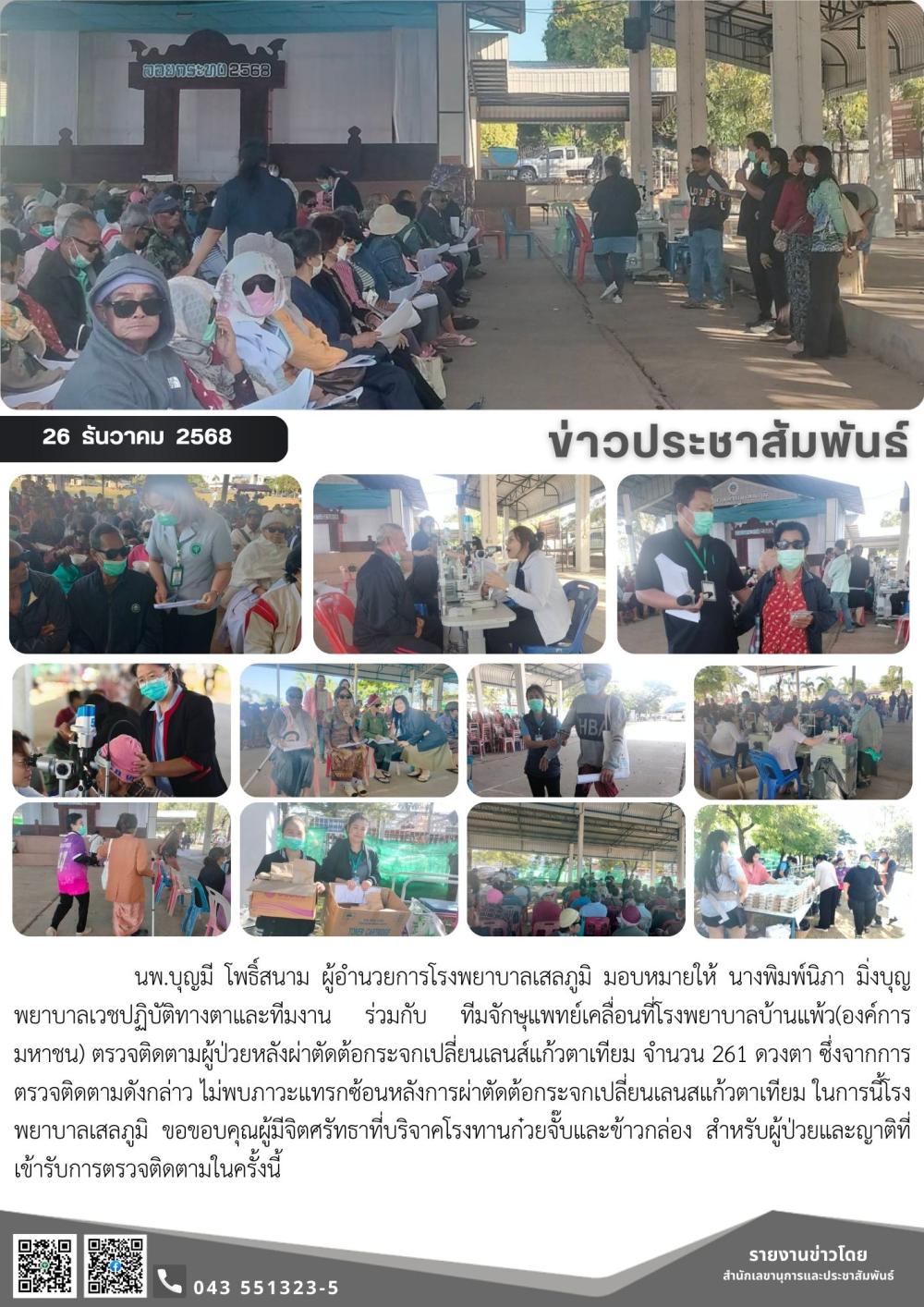 วันที่ 26 ธันวาคม 2568 นพ.บุญมี โพธิ์สนาม ผู้อำนวยการโรงพยาบาลเสลภูมิ มอบหมายให้ นางพิมพ์นิภา มิ่งบุญ พยาบาลเวชปฏิบัติทางตาและทีมงาน ร่วมกับ ทีมจักษุแพทย์เคลื่อนที่โรงพยาบาลบ้านแพ้ว(องค์การมหาชน) ตรวจติดตามผู้ป่วยหลังผ่าตัดต้อกระจกเปลี่ยนเลนส์แก้วตาเทียม จำนวน 261 ดวงตา ซึ่งจากการตรวจติดตามดังกล่าว ไม่พบภาวะแทรกซ้อนหลังการผ่าตัดต้อกระจกเปลี่ยนเลนสแก้วตาเทียม ในการนี้โรงพยาบาลเสลภูมิ ขอขอบคุณผู้มีจิตศรัทธาที่บริจาคโรงทานก๋วยจั๊บและข้าวกล่อง สำหรับผู้ป่วยและญาติที่เข้ารับการตรวจติดตามในครั้งนี้