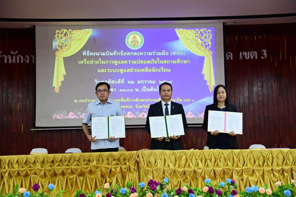 ในการนี้ นายศิวะทัศน์ สุขสุวรรณ ผู้อำนวยการสำนักงานเขตพื้นที่การศึกษาประถมศึกษาร้อยเอ็ด เขต 3 ได้เข้าร่วมลงนามในบันทึกข้อตกลงดังกล่าว โดยมีผู้แทนจากหน่วยงานที่เกี่ยวข้องเข้าร่วมเป็นสักขีพยาน เพื่อพัฒนาระบบดูแลช่วยเหลือนักเรียนให้มีความเข้มแข็ง ครอบคลุมและมีประสิทธิภาพ พร้อมป้องกัน เฝ้าระวัง แก้ไข ช่วยเหลือนักเรียนที่มีปัญหาด้านการเรียน พฤติกรรมสุขภาพ จิตใจ สังคม และความปลอดภัย