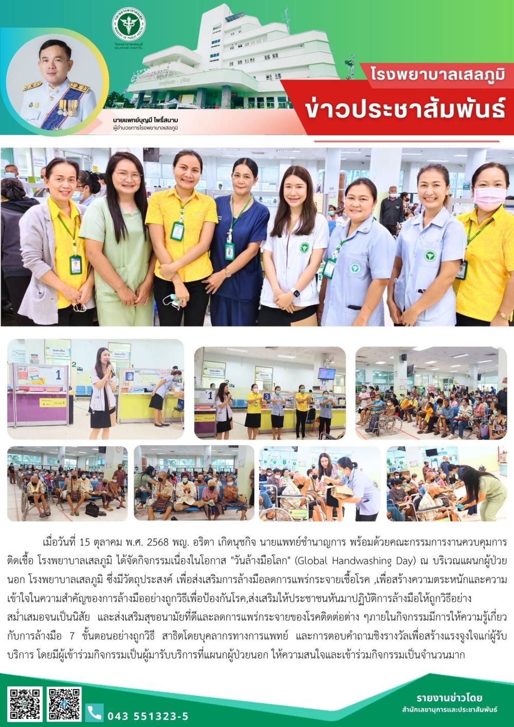 เมื่อวันที่ 15 ตุลาคม พ.ศ. 2568 พญ. อริตา เกิดนุชกิจ นายแพทย์ชำนาญการ พร้อมด้วยคณะกรรมการงานควบคุมการติดเชื้อ โรงพยาบาลเสลภูมิ ได้จัดกิจกรรมเนื่องในโอกาส "วันล้างมือโลก" (Global Handwashing Day) ณ บริเวณแผนกผู้ป่วยนอก โรงพยาบาลเสลภูมิ ซึ่งมีวัตถุประสงค์ เพื่อส่งเสริมการล้างมือลดการแพร่กระจายเชื้อโรค ,เพื่อสร้างความตระหนักและความเข้าใจในความสำคัญของการล้างมืออย่างถูกวิธีเพื่อป้องกันโรค,ส่งเสริมให้ประชาชนหันมาปฏิบัติการล้างมือให้ถูกวิธีอย่างสม่ำเสมอจนเป็นนิสัย และส่งเสริมสุขอนามัยที่ดีและลดการแพร่กระจายของโรคติดต่อต่าง ๆภายในกิจกรรมมีการให้ความรู้เกี่ยวกับการล้างมือ 7 ขั้นตอนอย่างถูกวิธี สาธิตโดยบุคลากรทางการแพทย์ และการตอบคำถามชิงรางวัลเพื่อสร้างแรงจูงใจแก่ผู้รับบริการ โดยมีผู้เข้าร่วมกิจกรรมเป็นผู้มารับบริการที่แผนกผู้ป่วยนอก ให้ความสนใจและเข้าร่วมกิจกรรมเป็นจำนวนมาก