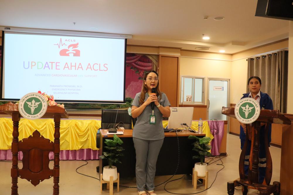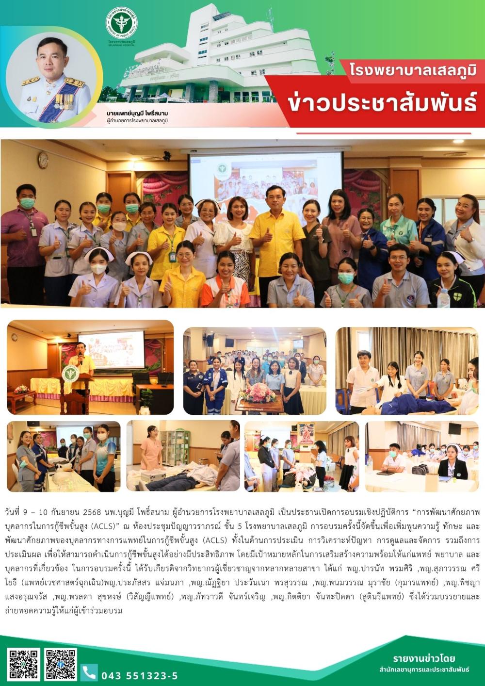 นพ.บุญมี โพธิ์สนาม ผู้อำนวยการโรงพยาบาลเสลภูมิ เป็นประธานเปิดการอบรมเชิงปฏิบัติการ “การพัฒนาศักยภาพบุคลากรในการกู้ชีพขั้นสูง (ACLS)” ณ ห้องประชุมปัญญาวราภรณ์ ชั้น 5 โรงพยาบาลเสลภูมิ การอบรมครั้งนี้จัดขึ้นเพื่อเพิ่มพูนความรู้ ทักษะ และพัฒนาศักยภาพของบุคลากรทางการแพทย์ในการกู้ชีพขั้นสูง (ACLS) ทั้งในด้านการประเมิน การวิเคราะห์ปัญหา การดูแลและจัดการ รวมถึงการประเมินผล เพื่อให้สามารถดำเนินการกู้ชีพขั้นสูงได้อย่างมีประสิทธิภาพ โดยมีเป้าหมายหลักในการเสริมสร้างความพร้อมให้แก่แพทย์ พยาบาล และบุคลากรที่เกี่ยวข้อง ในการอบรมครั้งนี้ ได้รับเกียรติจากวิทยากรผู้เชี่ยวชาญจากหลากหลายสาขา ได้แก่ พญ.ปารนัท พรมศิริ ,พญ.สุภาวรรณ ศรีโยธี (แพทย์เวชศาสตร์ฉุกเฉิน) พญ.ประภัสสร แจ่มนภา ,พญ.ณัฏฐิยา ประวันเนา พรสุวรร ,พญ.พนมวรรณ มุราชัย (กุมารแพทย์) ,พญ.พิชญา แสงอรุณจรัส ,พญ.พรลดา สุขหงษ์ (วิสัญญีแพทย์) ,พญ.ภัทราวดี จันทร์เจริญ ,พญ.กิตติยา จันทะปิดตา (สูตินรีแพทย์) ซึ่งได้ร่วมบรรยายและถ่ายทอดความรู้ให้แก่ผู้เข้าร่วมอบรม