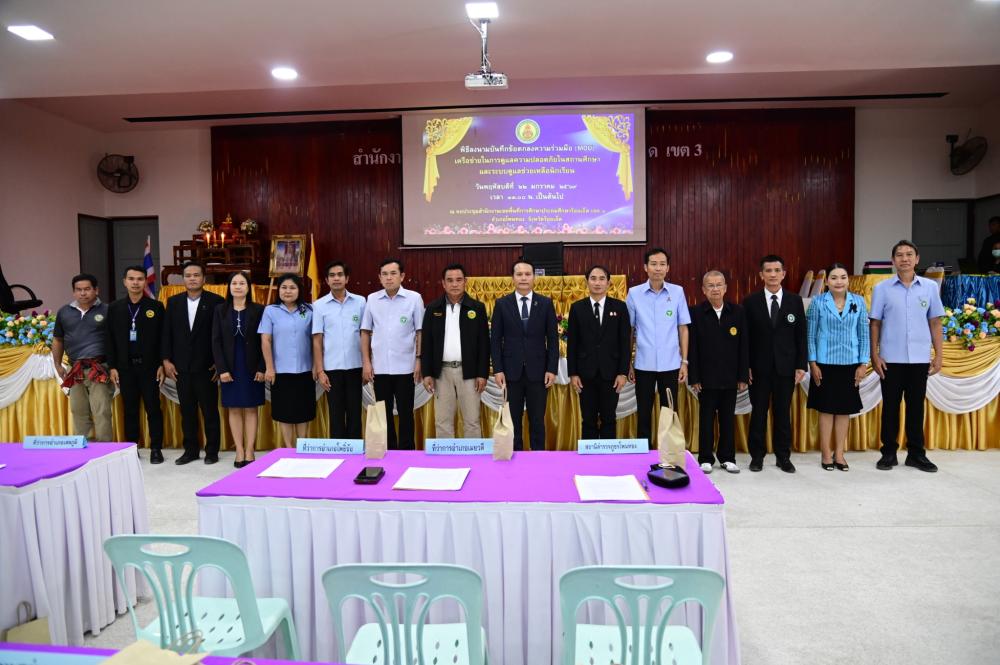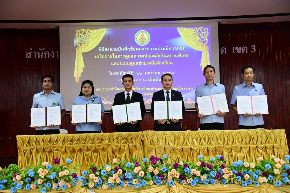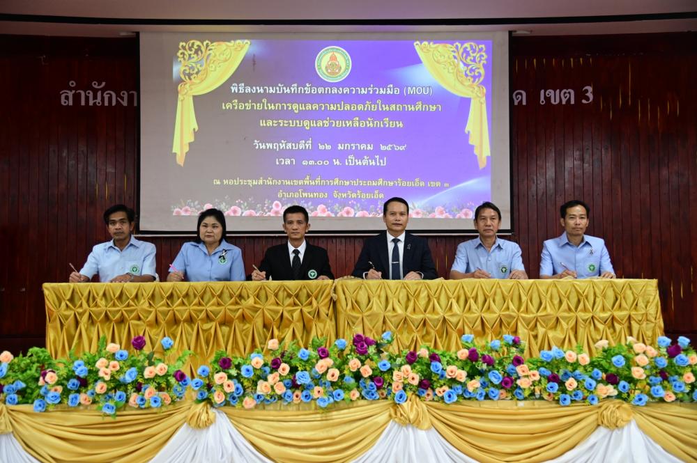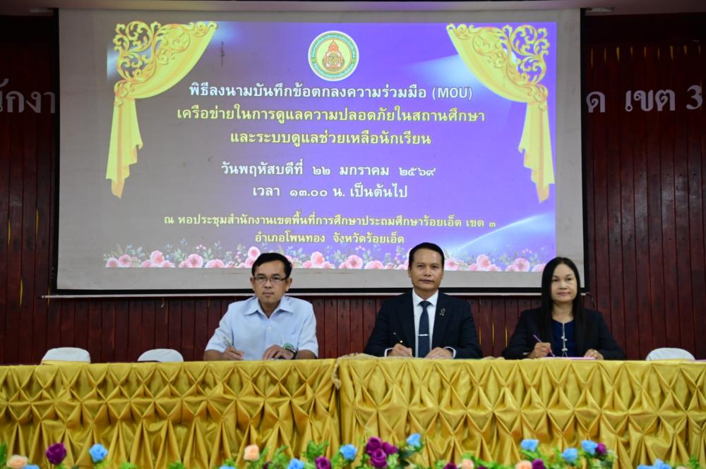 ในการนี้ นายศิวะทัศน์ สุขสุวรรณ ผู้อำนวยการสำนักงานเขตพื้นที่การศึกษาประถมศึกษาร้อยเอ็ด เขต 3 ได้เข้าร่วมลงนามในบันทึกข้อตกลงดังกล่าว โดยมีผู้แทนจากหน่วยงานที่เกี่ยวข้องเข้าร่วมเป็นสักขีพยาน เพื่อพัฒนาระบบดูแลช่วยเหลือนักเรียนให้มีความเข้มแข็ง ครอบคลุมและมีประสิทธิภาพ พร้อมป้องกัน เฝ้าระวัง แก้ไข ช่วยเหลือนักเรียนที่มีปัญหาด้านการเรียน พฤติกรรมสุขภาพ จิตใจ สังคม และความปลอดภัย