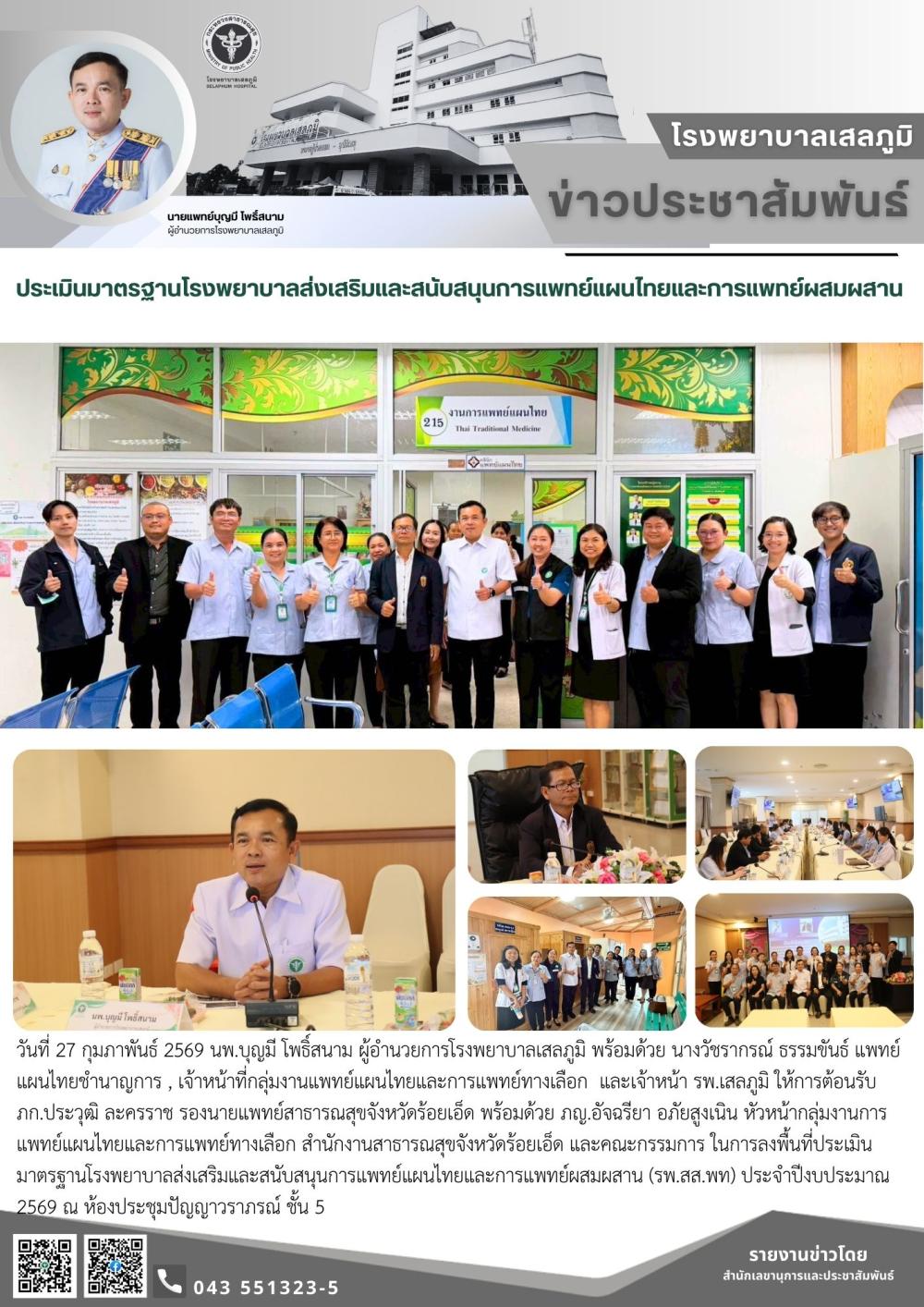 วันที่ 27 กุมภาพันธ์ 2569 นพ.บุญมี โพธิ์สนาม ผู้อำนวยการโรงพยาบาลเสลภูมิ พร้อมด้วย นางวัชรากรณ์ ธรรมขันธ์ แพทย์แผนไทยชำนาญการ , เจ้าหน้าที่กลุ่มงานแพทย์แผนไทยและการแพทย์ทางเลือก และเจ้าหน้า รพ.เสลภูมิ ให้การต้อนรับ ภก.ประวุฒิ ละครราช รองนายแพทย์สาธารณสุขจังหวัดร้อยเอ็ด พร้อมด้วย ภญ.อัจฉรียา อภัยสูงเนิน หัวหน้ากลุ่มงานการแพทย์แผนไทยและการแพทย์ทางเลือก สำนักงานสาธารณสุขจังหวัดร้อยเอ็ด และคณะกรรมการ ในการลงพื้นที่ประเมินมาตรฐานโรงพยาบาลส่งเสริมและสนับสนุนการแพทย์แผนไทยและการแพทย์ผสมผสาน (รพ.สส.พท) ประจำปีงบประมาณ 2569 ณ ห้องประชุมปัญญาวราภรณ์ ชั้น 5